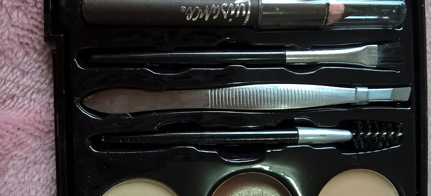 O Kit contém 3 tonalidades de sombras, 2 tonalidades de pasta para fixar as sombras (que na pele ficam muito parecidas as tonalidades), 1 sombra iluminadora, 1 lápis marrom, 1 pincel chanfrado, 1 pinça, 3 moldes para sobrancelhas e 1 escovinha.